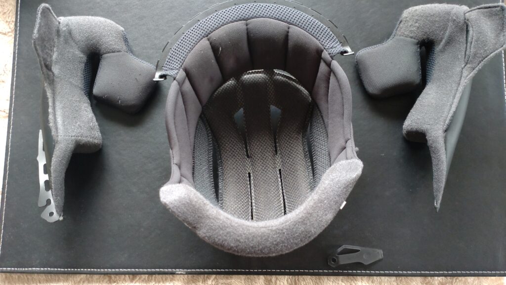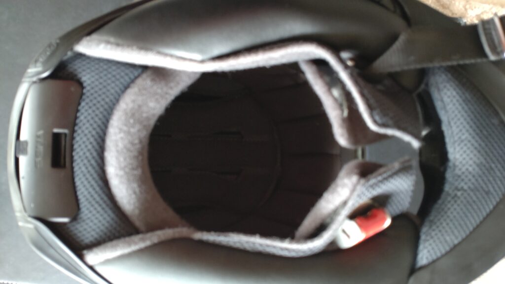 サイドインナー側の止め具の一部がコードと干渉する部分はハサミで切り込みを入れるとよさげでした。インカムをヘルメット内側に収めることができたら外していたインナーを取り付けて完成です。