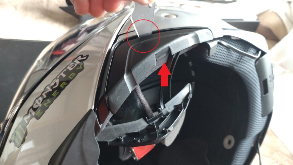インターフェイスの部品はヘルメット付属の治具で隙間に挿入して爪を押し下げると外れました。