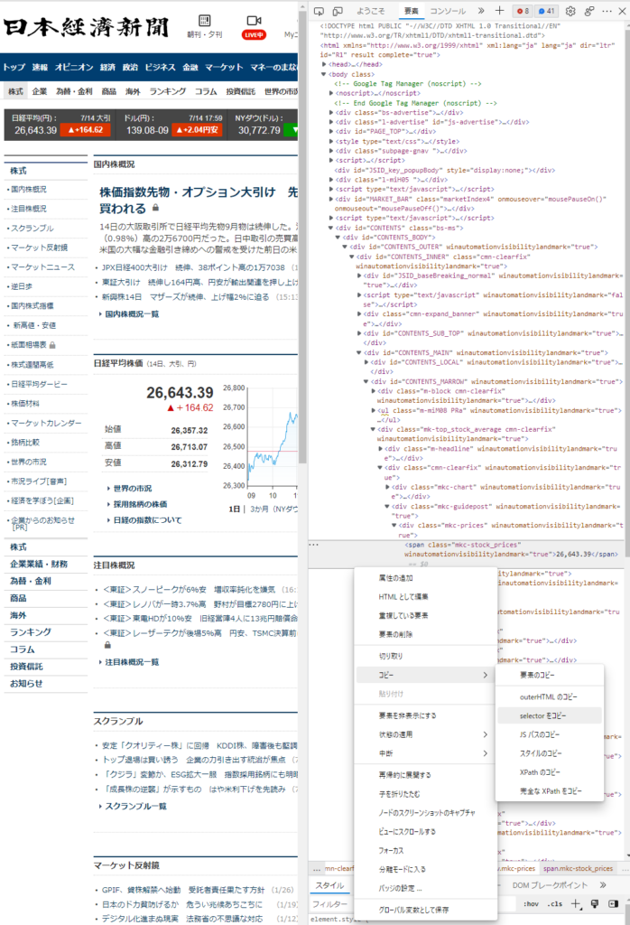 続いて左ペインの [ブラウザー自動化]-[Web データ抽出]-[Web ページからデータを抽出する] をダブルクリックして Excel スプレッドシートを起動するダイアログを開いた状態で Microsoft Edge で取得したいWebページを開いてショートカット [Ctrl]+[Shift]+[I] または、[設定]-[その他のツール]-[開発者ツール]を起動して取得したいデータのCSSセレクターをコピーします。