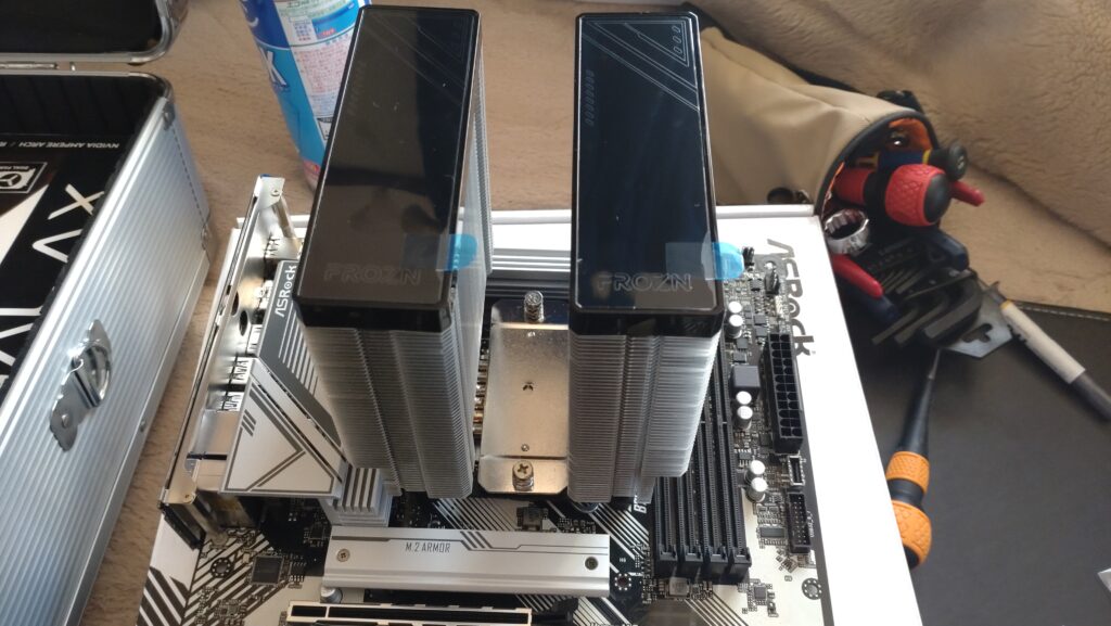 メモリは手持ちのDDR4-2666 8GB×4(32GB)を使うことも考えましたが動画編集と今後のメモリ高騰と拡張性を考えてDDR4-3200×2(64GB)を新たに購入することにしました。メモリ代を除けば20万円強で収まる費用だったのですが新規購入で9万円追加に費用が掛かってしまいました。メモリの発送が遅れていてまだ届いてないのでとりあえず手持ちの8GB×2(16GB)をマザーボードに差してCPUと電源、SSDを組み立てることにしました。