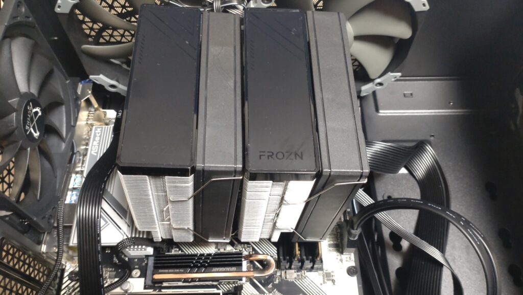次にCPUにグリスを米粒サイズだけ塗ってCPUクーラーを取り付けました。(裏側のシール剥がしを忘れずに)