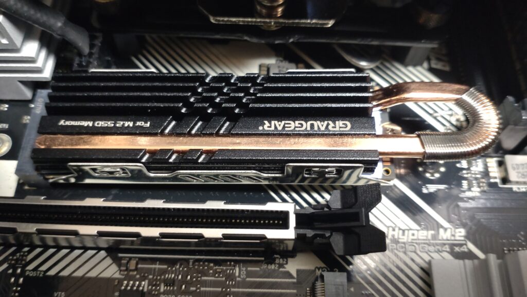 SSDはヒートシンクを取り付けてマザーボードに組み付けました。