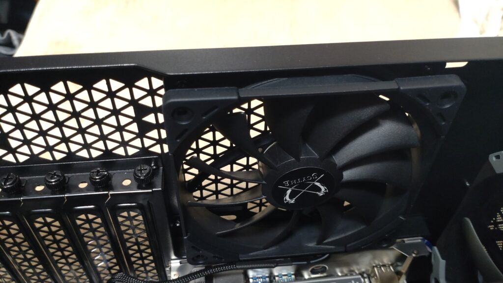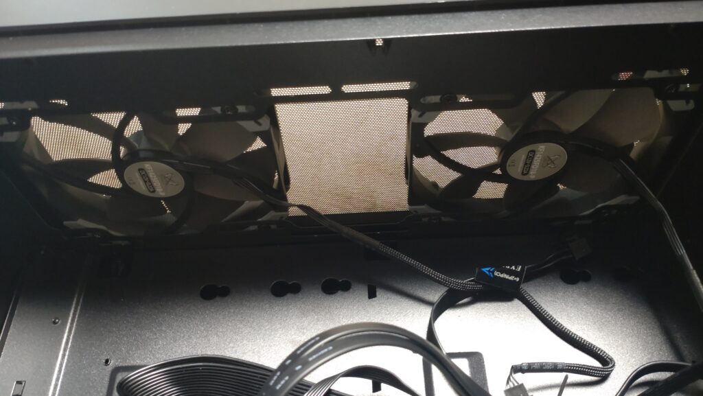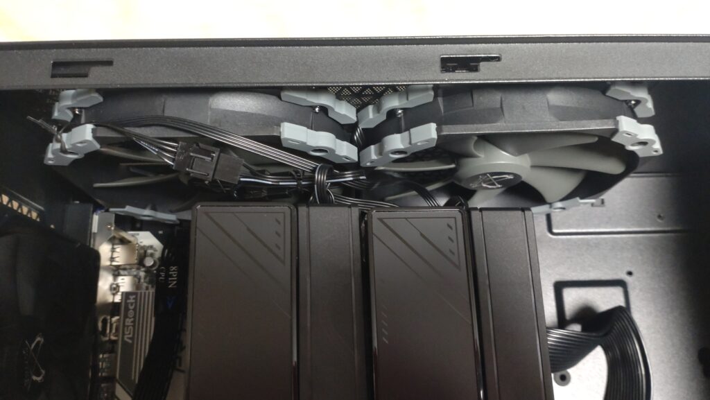 付属のケースファンはPWM非対応の3ピンケーブルだったのでマザーボードに差すことができず4ピンのPWN対応ファンに交換となりました。またトップとリアは排気なのでファンの取り付け向きに注意しました。