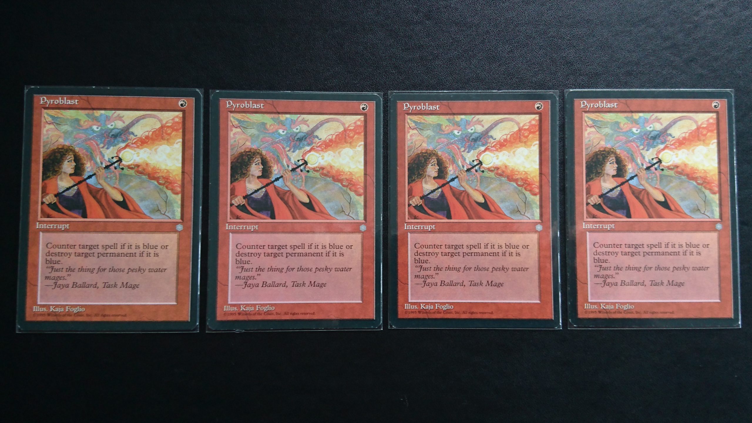 「アイスエイジ」のコモンの色対策で《水流破》《青霊破》と対で採録されてきました。赤1マナインスタントで、効果は「呪文1つを対象としてその色が青の場合、それを打ち消す。または、パーマネント1つを対象としその色が青のときそれを破壊する。」となっています。色対策なので環境が青いレガシーでは特に刺さるカードで青白奇跡コンはこのカードのためにタッチ赤したり、ペインターは色指定に青と言うのが定番となっています。同型スペルの《赤霊破》との違いは、if節で呪文の誘発時と解決時に色をチェックするところです。