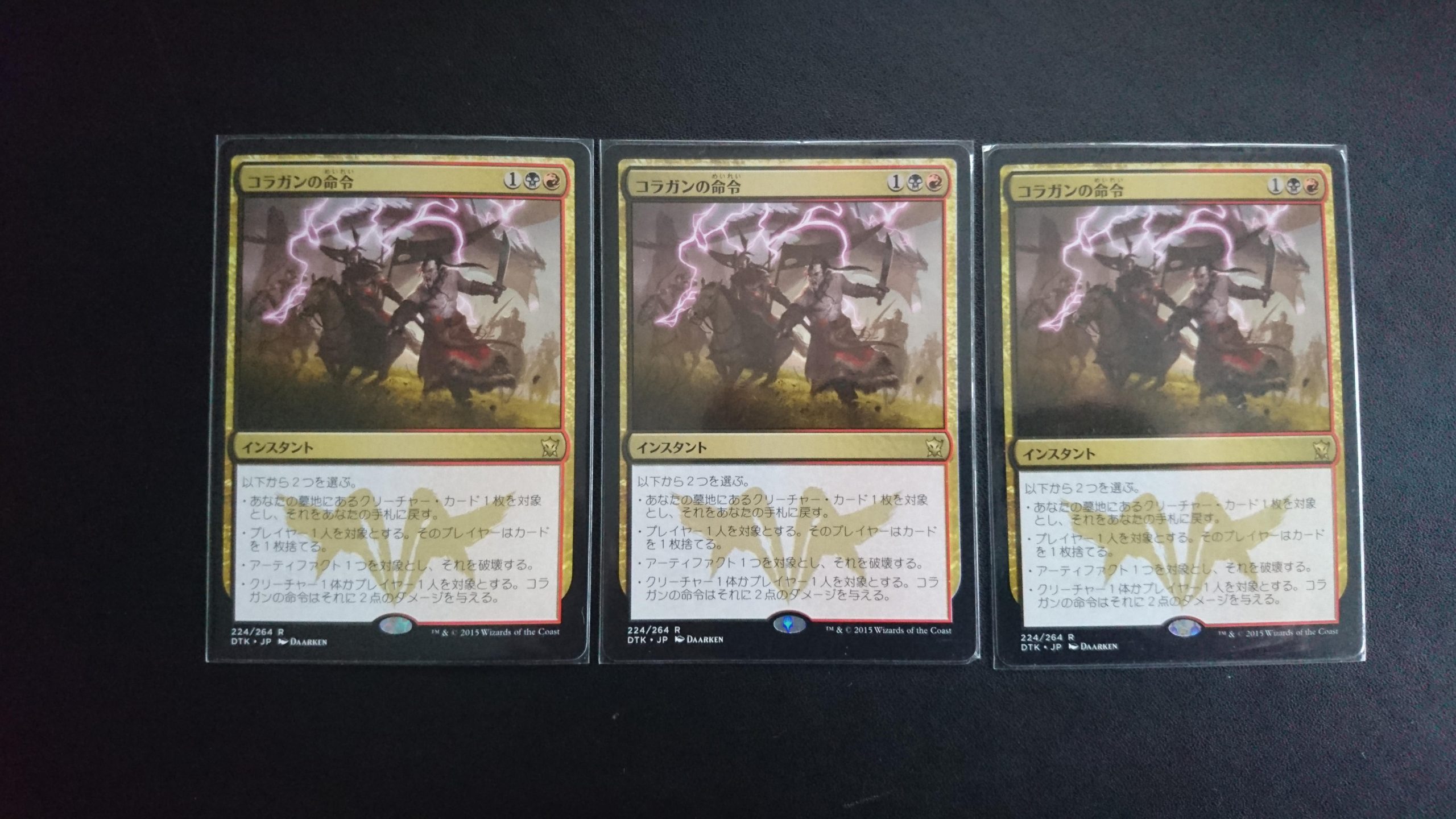 以下から2つを選ぶ。 ・あなたの墓地にあるクリーチャー・カード1枚を対象とし、それをあなたの手札に戻す。 ・プレイヤー1人を対象とする。そのプレイヤーはカードを1枚捨てる。 ・アーティファクト1つを対象とし、それを破壊する。 ・クリーチャー1体かプレインズウォーカー1体かプレイヤー1人を対象とする。コラガンの命令はそれに2点のダメージを与える。