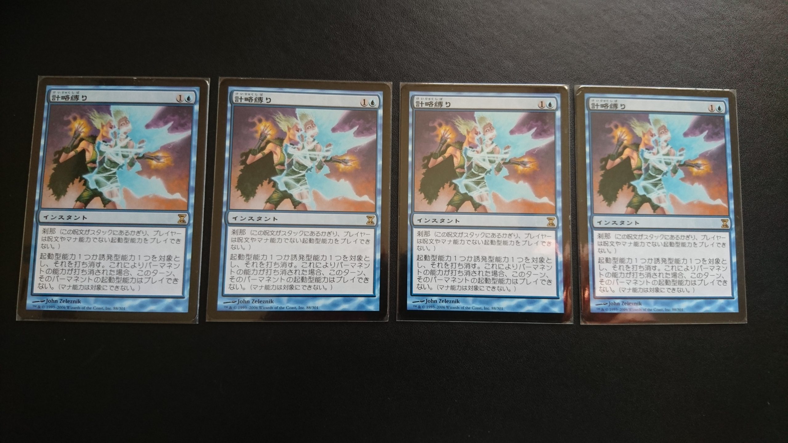 Card, Legacy, Modern, Standard 計略縛り 2019年12月7日 gusachan コメントする 「時のらせん」でデザインされた起動型能力か誘発型能力を打ち消す1マナ重い、刹那付きの《もみ消し》。 《もみ消し》同様、《師範の占い独楽》のライブラリートップに戻る能力やフェッチの起動、ストーム呪文の誘発など幅広い能力を打ち消すことができます。「ティムールデルバー」でおなじみのレガシーではコストの軽い《もみ消し》が優先して使われていますが、モダンで使うならこちらです。 計略縛り(日本語版)