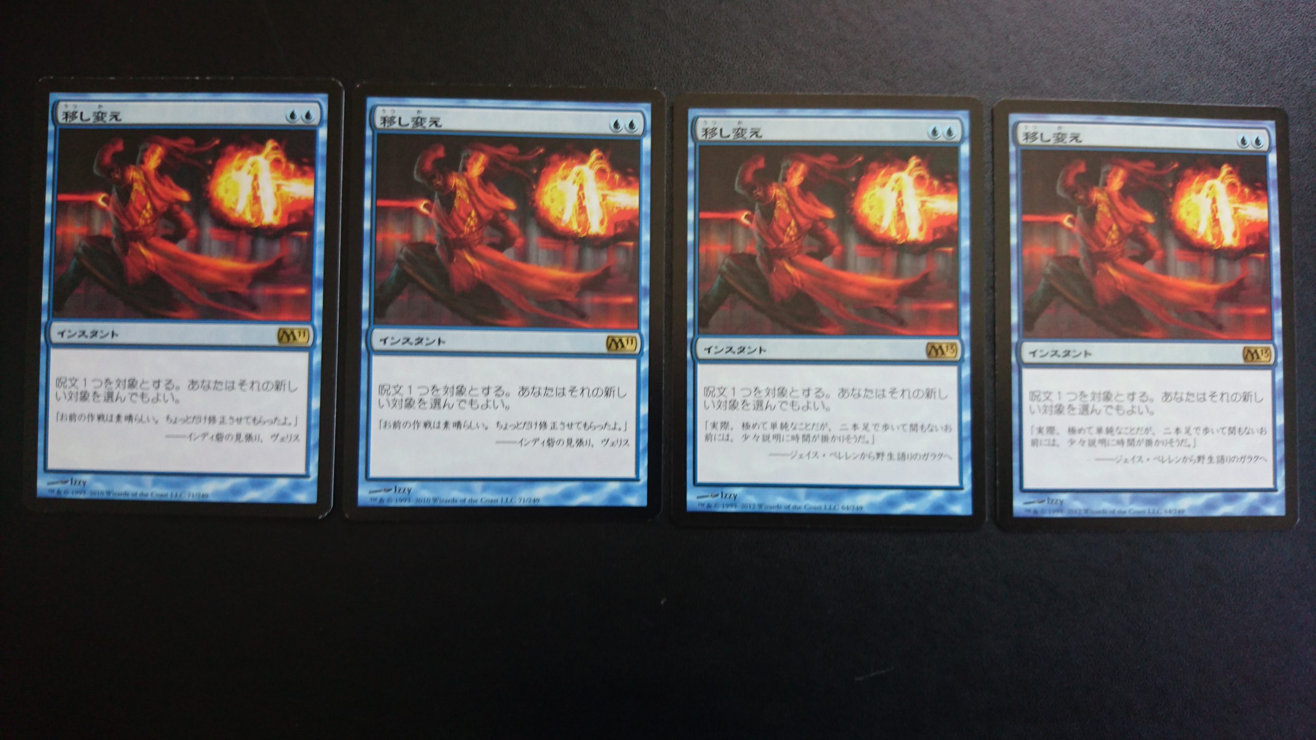 「基本セット2011」の青レアで呪文1つの対象を変更する2マナのインスタントです。4マナ《偏向》の上位互換かつ2マナとコストも軽く対戦相手の除去や直接火力をカード名の通り「移し替え」ることができます。対象変更の第1色は青なので珍しくない効果ですが、レガシーではピッチコストで唱えられる《誤った指図》があり2マナ浮かせて構えるのは難しいのかもしれません。「基本セット2013」で再録されました。
