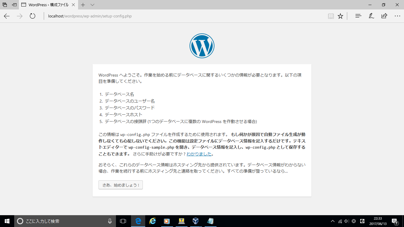で、httpd を再起動。すると、WordPress のwp-admin/setup-config.php が無事、表示されました。